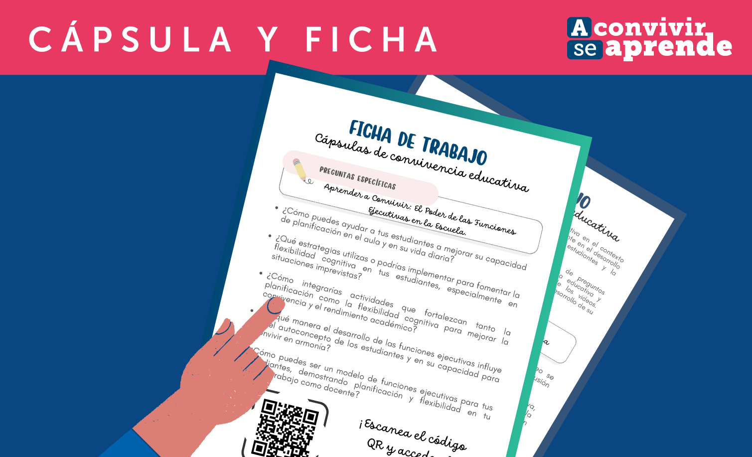 Ficha para reflexionar sobre el rol de las funciones ejecutivas en la convivencia escolar. Incluye preguntas guía vinculadas a la PNCE y un acceso a cápsula audiovisual mediante código QR.